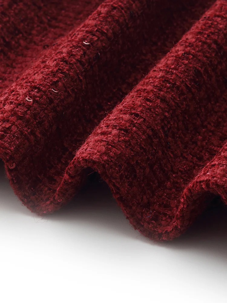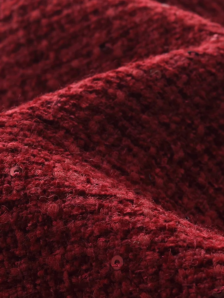This vibrant chili red wool-blend jacket is perfect for festive occasions like Christmas and Chinese New Year. Sparkling sequins add glamour, while the wave-shaped front enhances its unique design. Practical metal buttons complete the look. It effortlessly highlights a woman's charm, a must-have for both special events and everyday wear!